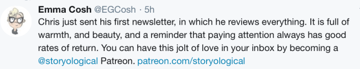 I’ve just sent out the February edition of CHRIS REVIEWS EVERYTHING, a monthly newsletter for Storyological patrons.