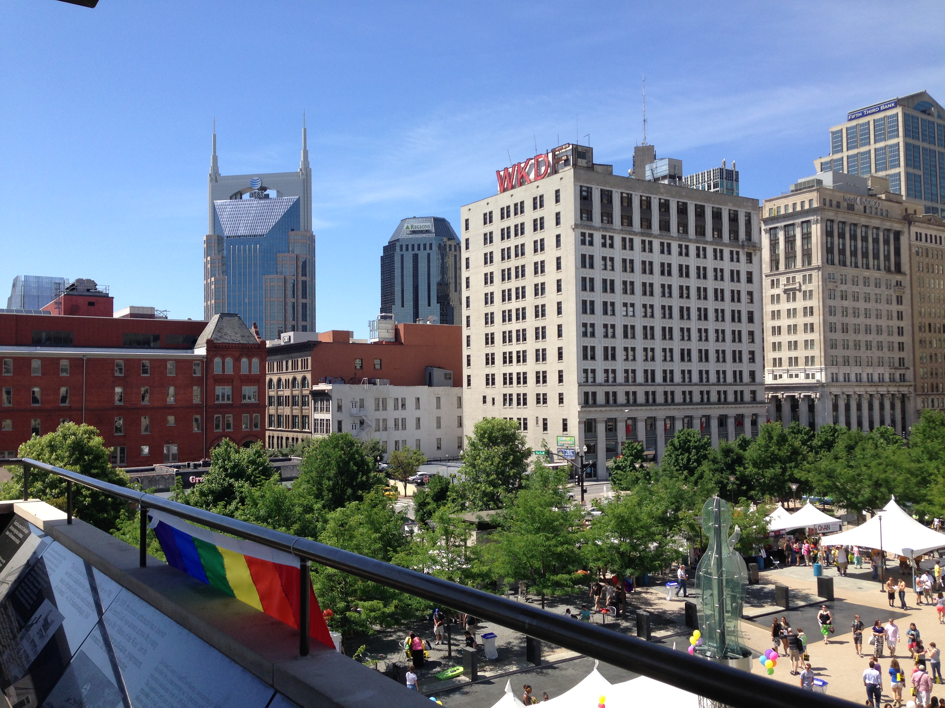 A view of downtown Nashville from the observation park in Public Square. Note the pride flag and Batman, the building.